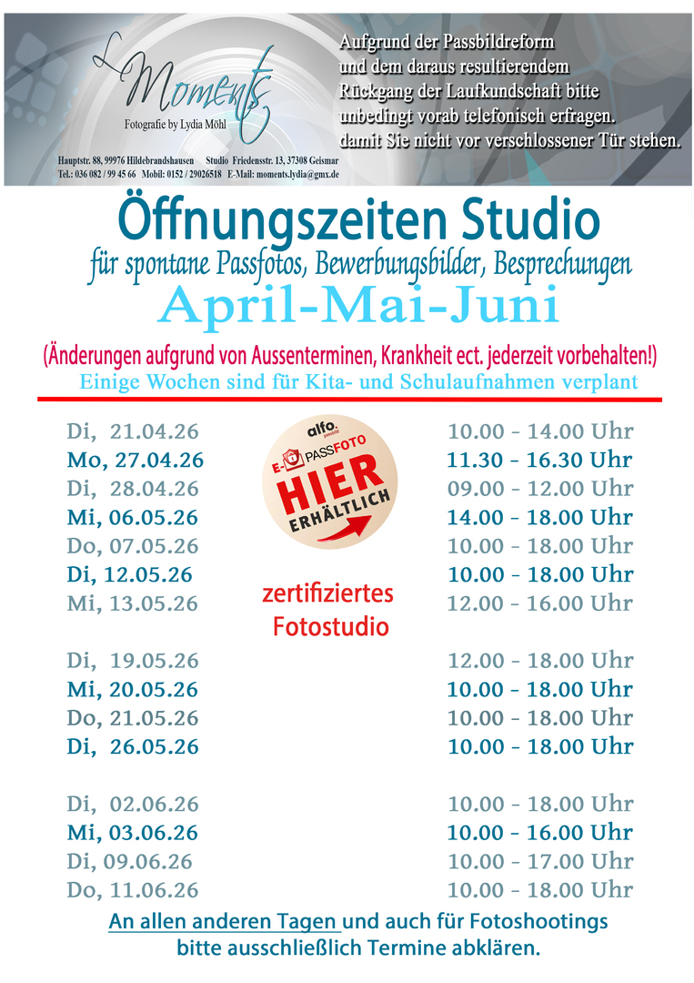 Pass- und Bewerbungsfotos sind vorzugsweise während dieser Zeiten mit Terminvergabe möglich: